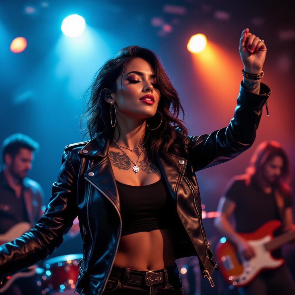 A vibrant drawing of a Latina woman dancing at a rock concert. The image captures the energy with bright lights and dynamic composition, conveying rebellion and freedom in a lively scene.