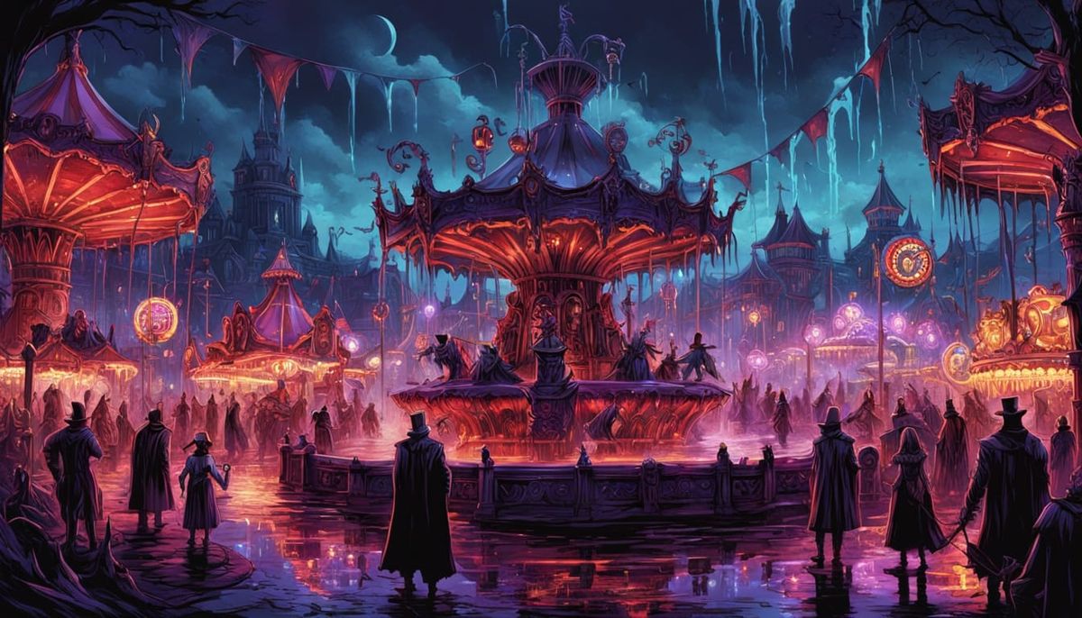 A striking picture of a fountain populated by playful vampires in a dark carnival setting. Red and violet water flows amid eerie rides and glowing lights, realized in a detailed comic book art style.