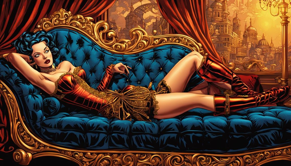 This image shows a woman in a corset reclining on a chaise lounge. The artwork is reminiscent of vibrant comic book art, featuring bold lines, vivid colors, and elegant typography.