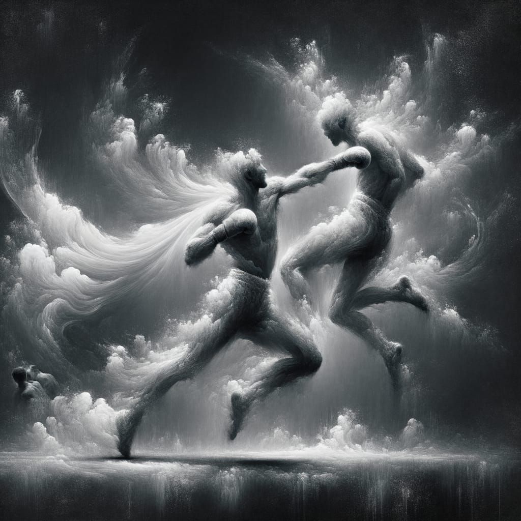 A captivating image showing white smoke forming two boxers in a fight. One boxer is throwing a punch while the other dodges, rendered with painterly techniques and textured brushwork against a dark backdrop.