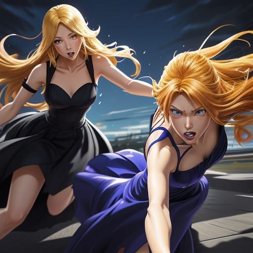 This dynamic anime illustration shows a brunette in a summer dress pinning a blonde in an evening dress. Features intense expressions, flowing hair, and dramatic backlighting with vibrant colors.