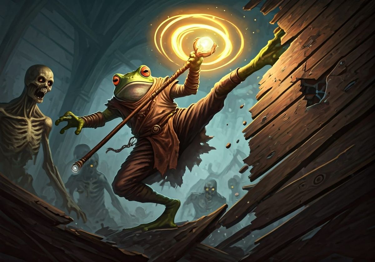 A fantasy image shows an elderly frog monk destroying a wall. Wearing tattered robes and wielding a magical staff, the monk confronts undead creatures in a dramatic scene with muted colors.