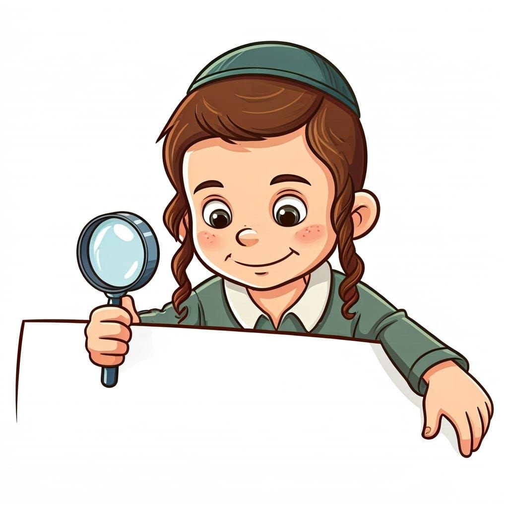 This image depicts a charming Haredi Jewish boy in a Raleigh style drawing, showcasing his innocence and curiosity as he examines a magnifying glass.