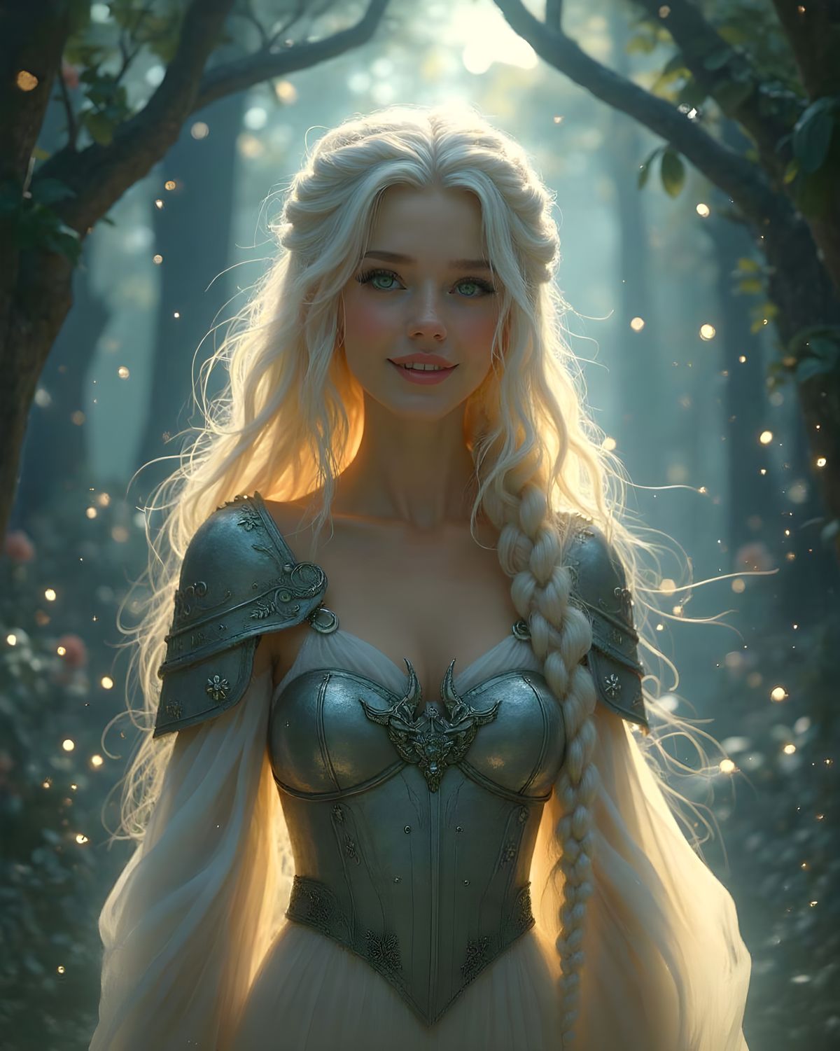 This image shows a smiling valkyrie in shining armor standing in a hidden glade. The artwork features ethereal lighting, vivid colors and intricate details in a romantic pre-raphaelite style.
