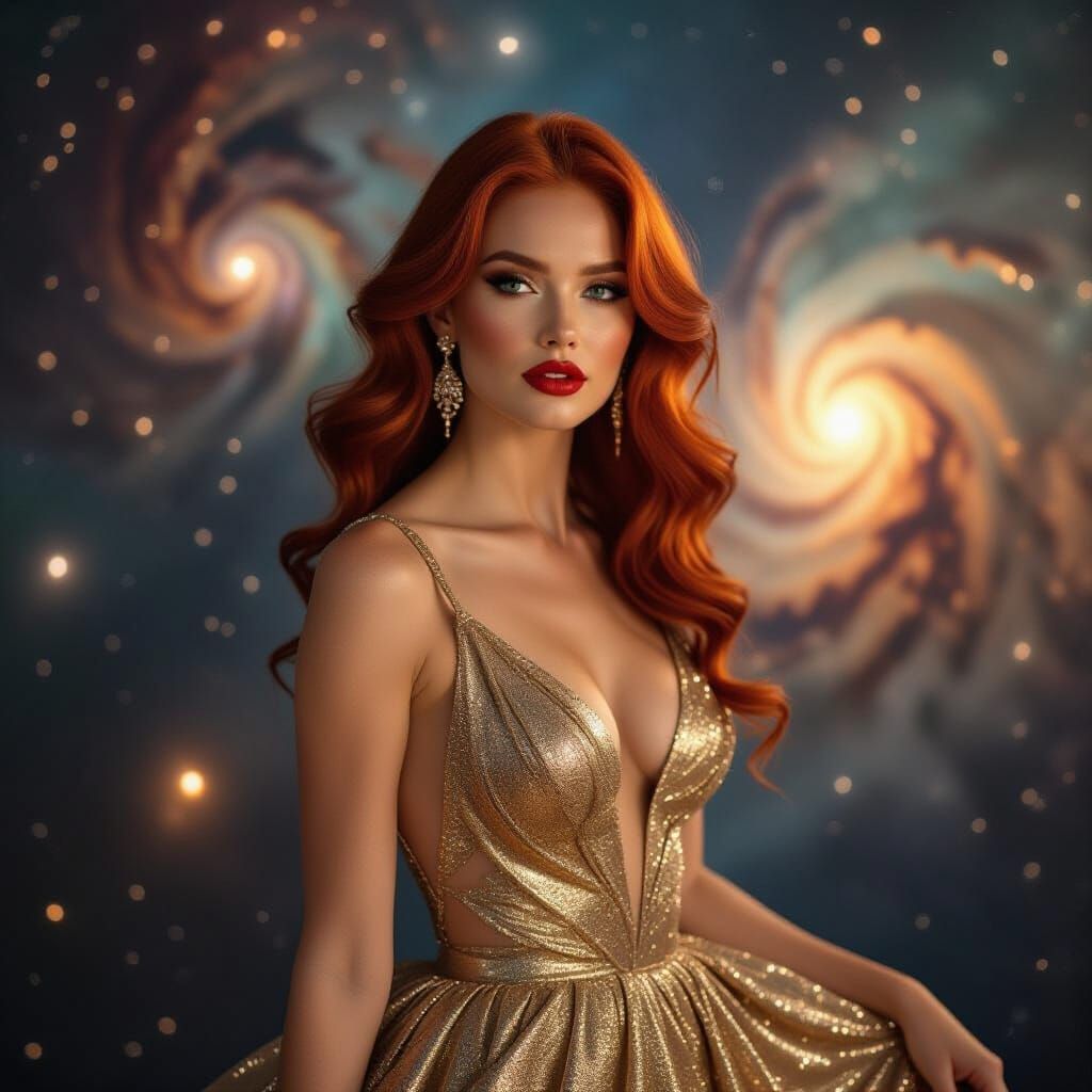 A digital painting of a woman with red hair in a gold gown posing in front of galaxies. This image captures ethereal beauty in a cinematic style.