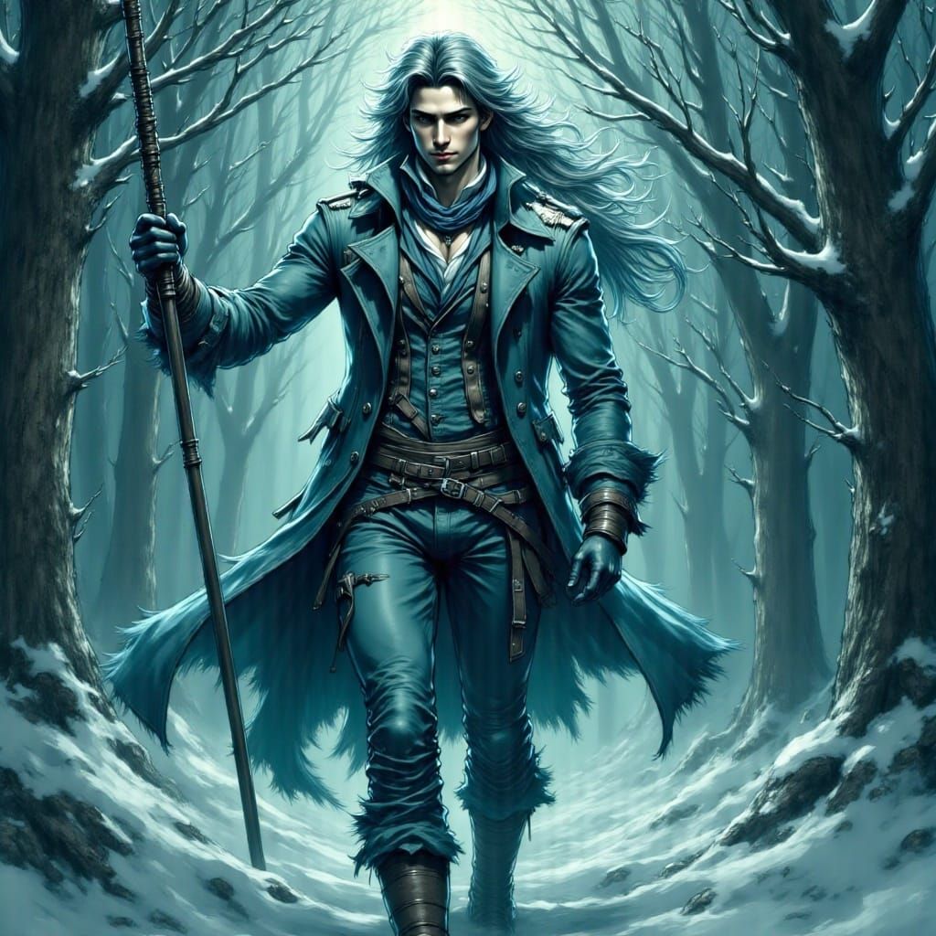 A striking picture of a male aurora spirit in a snowy forest. He has flowing hair of shimmering light and wears art nouveau attire in deep blues, greens, and purples, rendered in exquisite detail.