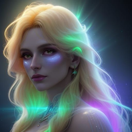 This image shows a close-up of Voskora Alludra with a glowing aura, captured in a kirlian photography style. Golden god rays illuminate the mystical atmosphere, creating a soft, ethereal effect.
