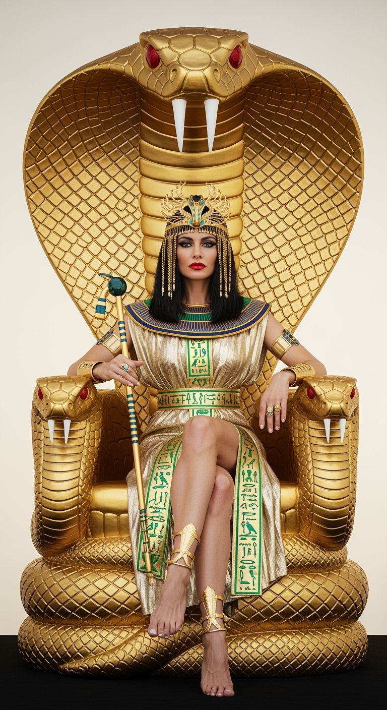 This image shows an Egyptian queen seated on a golden cobra throne. She wears a gold toga with hieroglyphs and cobra crown, holding a scepter, captured with natural lighting and a bokeh effect.