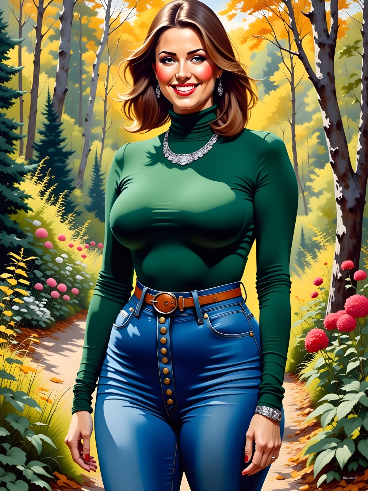 A striking oil painting of a beautiful, heavy woman in a garden. She wears a green turtleneck, denim jeans, and flat sneakers. The artwork is bright and detailed, using colored ink.