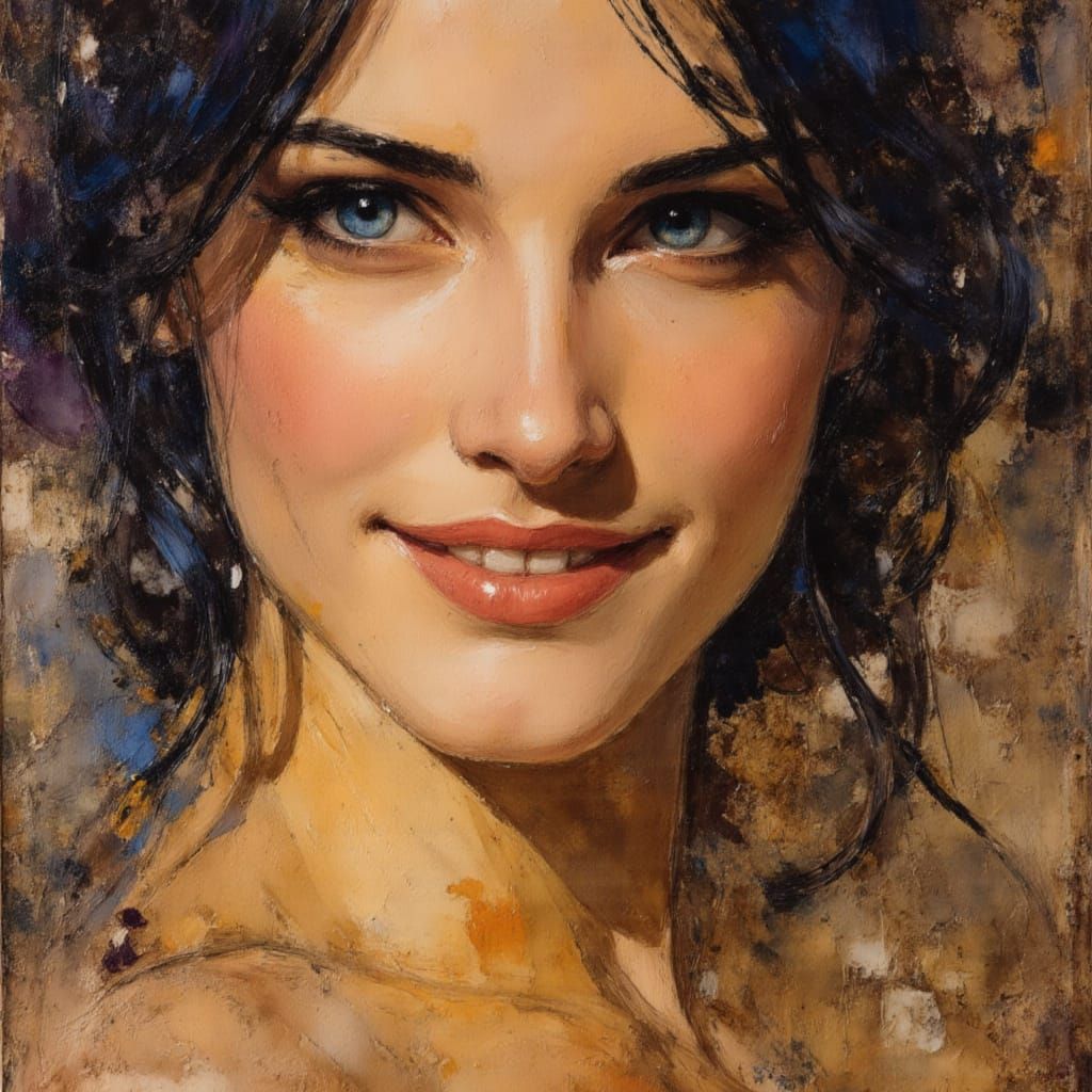 This image shows a smiling woman in a top-lit oil portrait. The artwork employs summer colors, heavy impasto, and visible brush strokes in a painterly style, reminiscent of Baroque art.