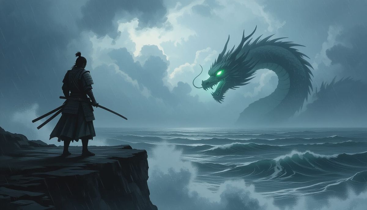 This image shows a lone samurai warrior facing a spectral dragon rising from a turbulent sea, silhouetted against a dramatic, stormy sky. Rendered in dark fantasy realism with vivid, storm-grey colors.