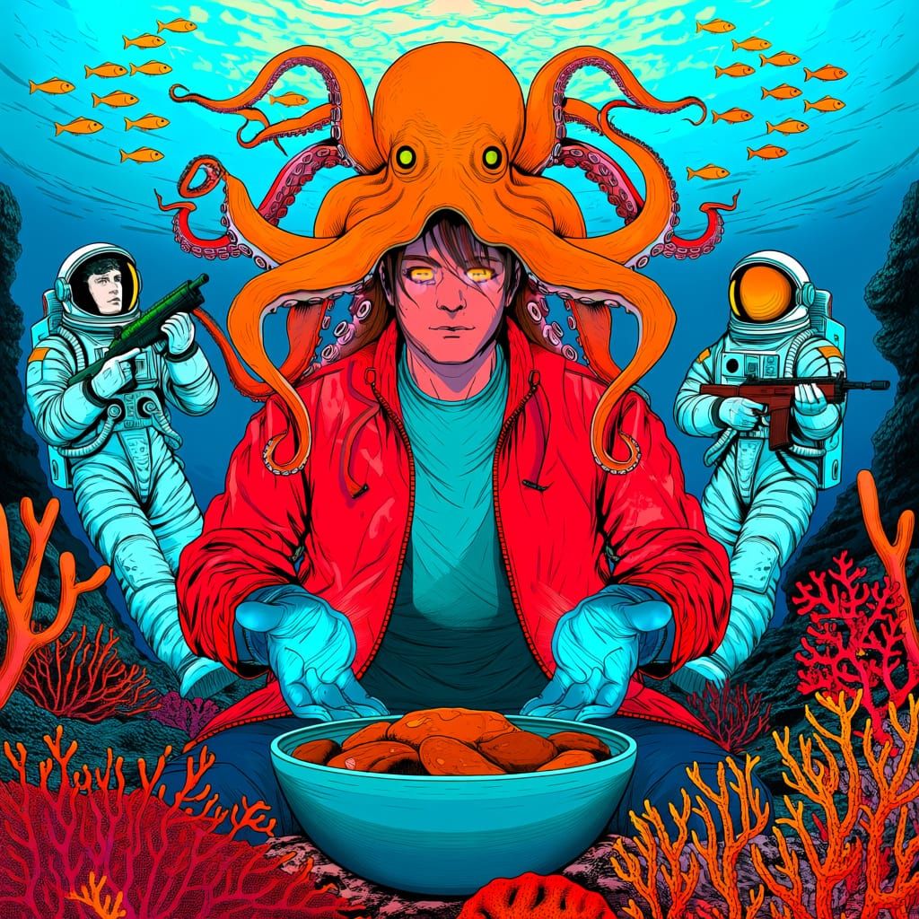 This vibrant, surreal illustration depicts a figure with an octopus on its head, surrounded by astronauts. The underwater scene features glowing eyes, weapons, and marine life in a striking blue, orange, and red palette.