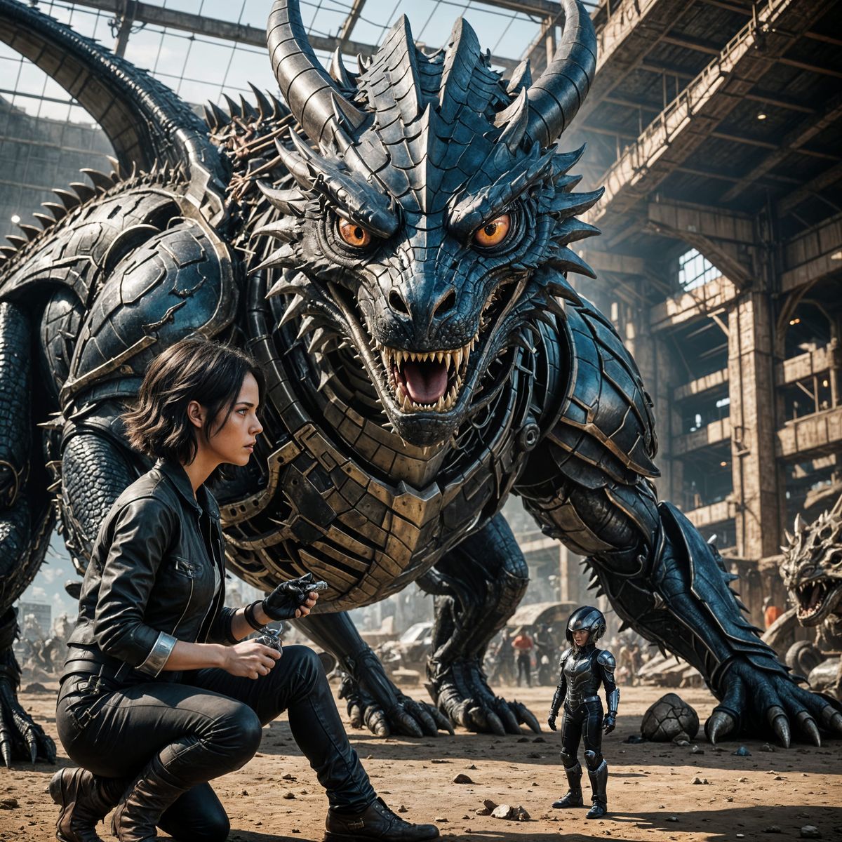 This image shows a striking scene from a fictional motorball derby, where a young woman gently interacts with a massive, intimidating dragon, showcasing photorealistic details and a cinematic atmosphere.