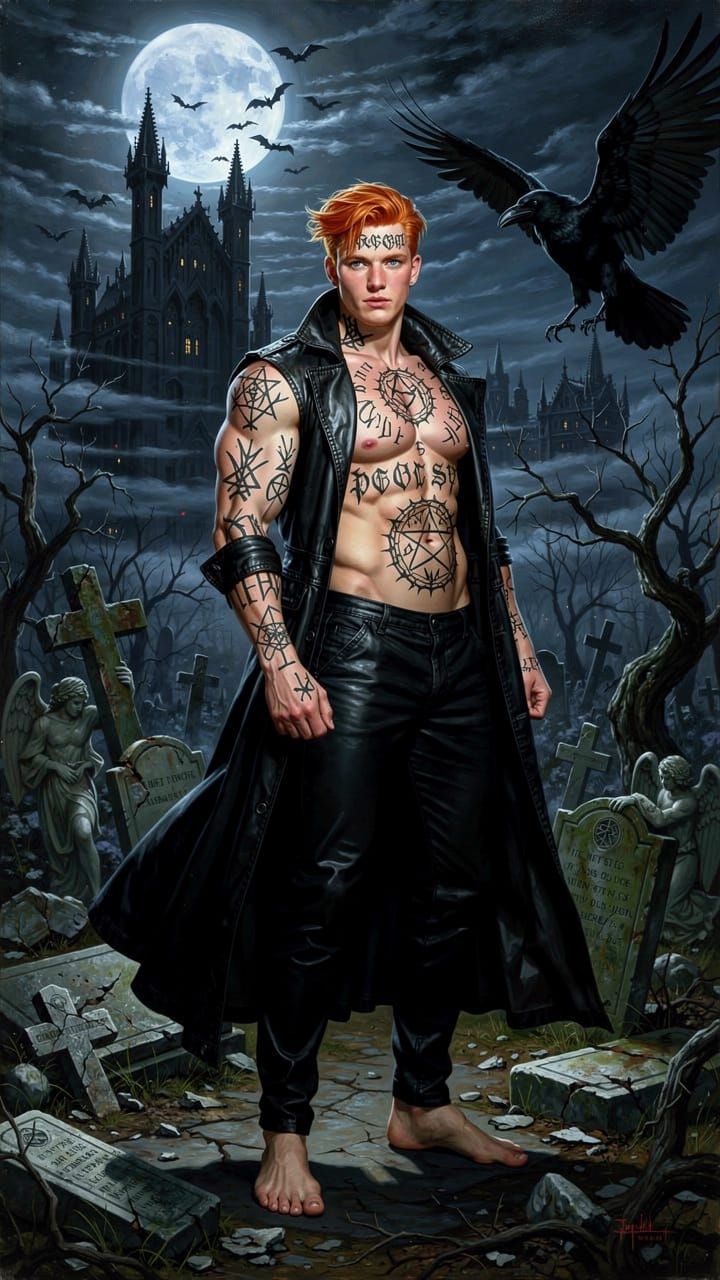 A shirtless, tattooed man with a leather coat stands in a dark graveyard before a sinister castle under a full moon. Masterpiece of classical Gothic art with dynamic lighting.