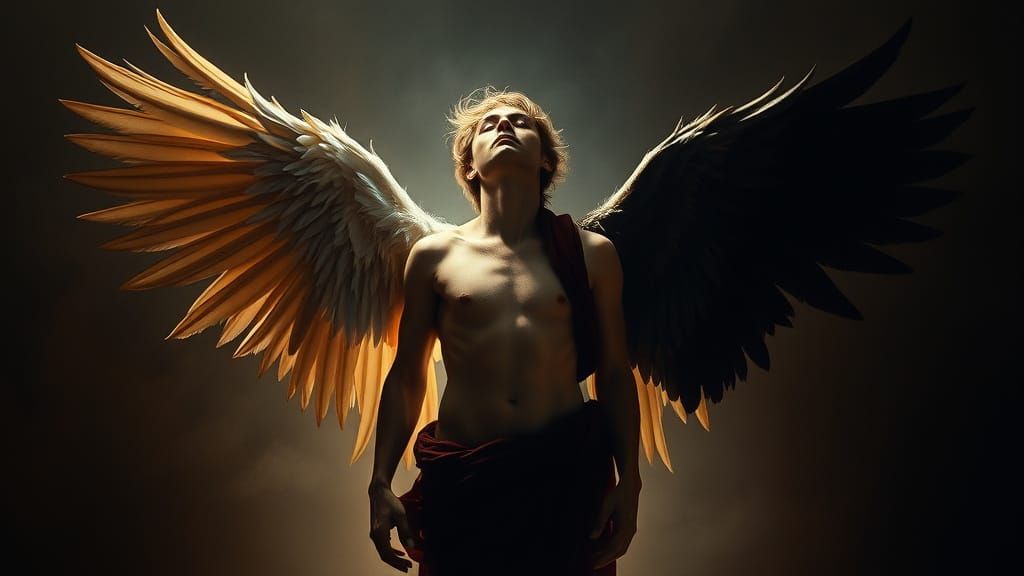 This image captures a figure embodying internal conflict, split between celestial light and shadowy depths. Rendered with dramatic chiaroscuro and intense color contrast, it evokes profound emotional impact.
