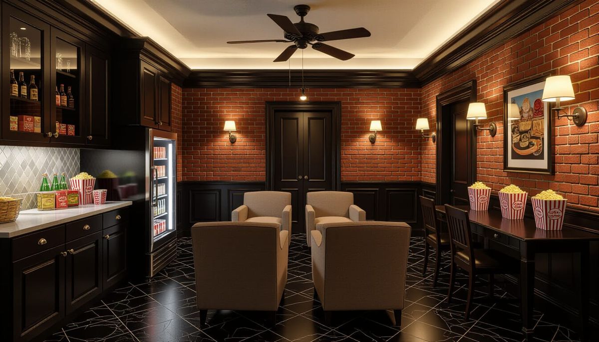 This hyperrealistic digital painting depicts a cozy Victorian movie room with marble floors, exposed brick, and a Smeg fridge. Features plush seating, a secret door, and warm, dramatic lighting for a cinematic feel.