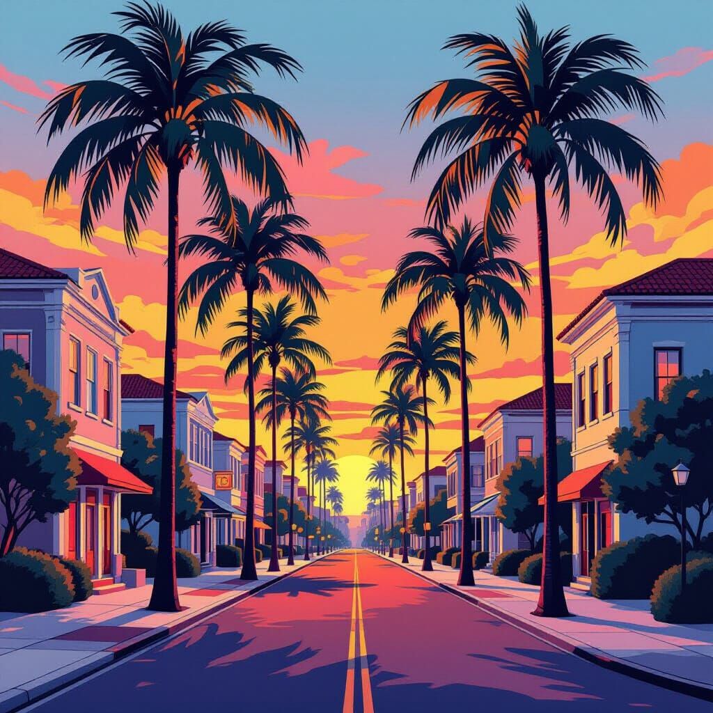 A serene street scene featuring palm trees in soft, warm colors with neon highlights. The image blends retro-futurism with abstract oil painting, incorporating screen print, pop art, and digital art elements with Bauhaus geometry.