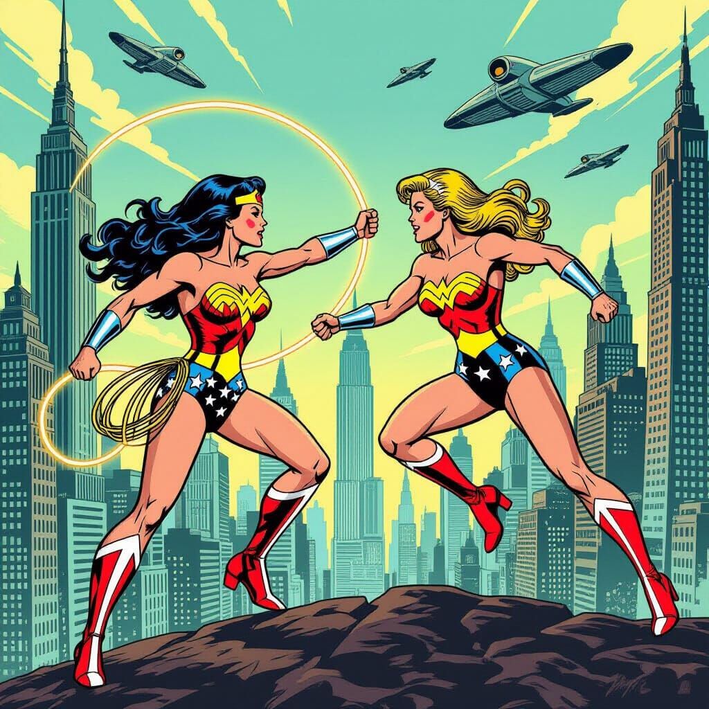 This image shows Wonder Woman and the Bionic Woman fighting crime together. The heroes are in a retro-futuristic city full of skyscrapers and flying vehicles, rendered in vintage comic book style with vibrant colors.