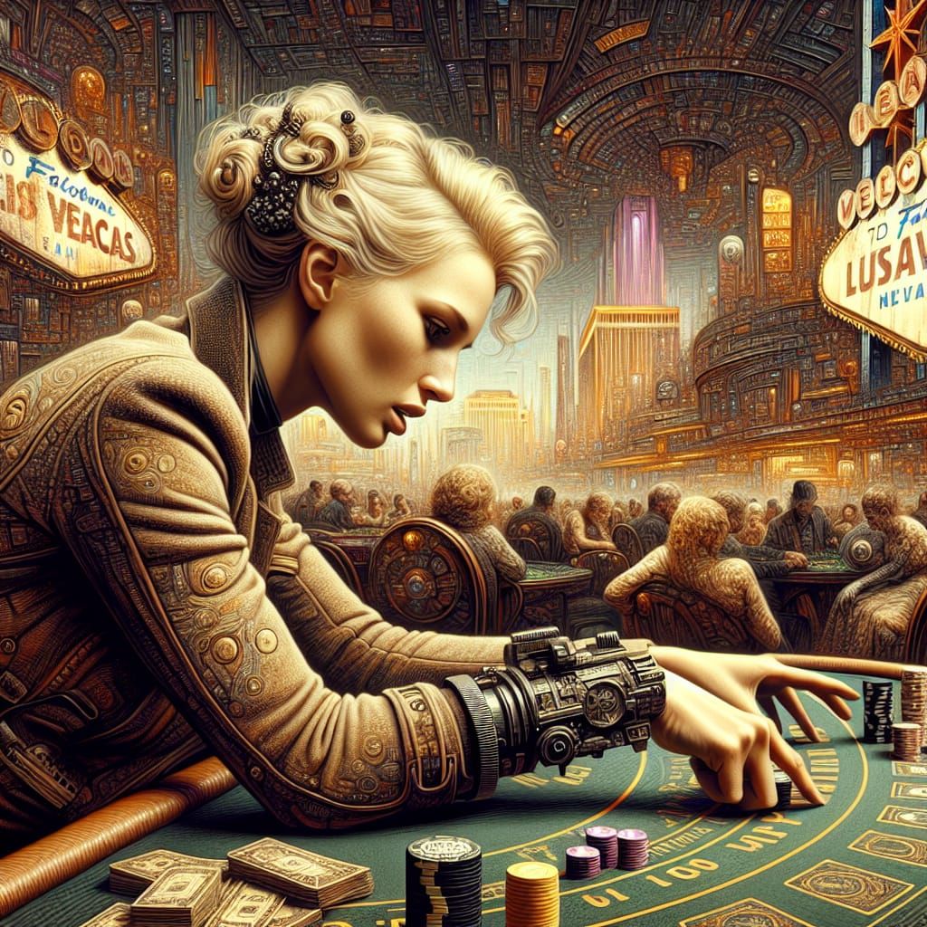 A gritty scene in an Art Deco Vegas casino features a blonde woman intensely playing blackjack. The image, reminiscent of the Ashcan School, captures a dieselpunk aesthetic with complex fractal details and a tetradic color scheme.