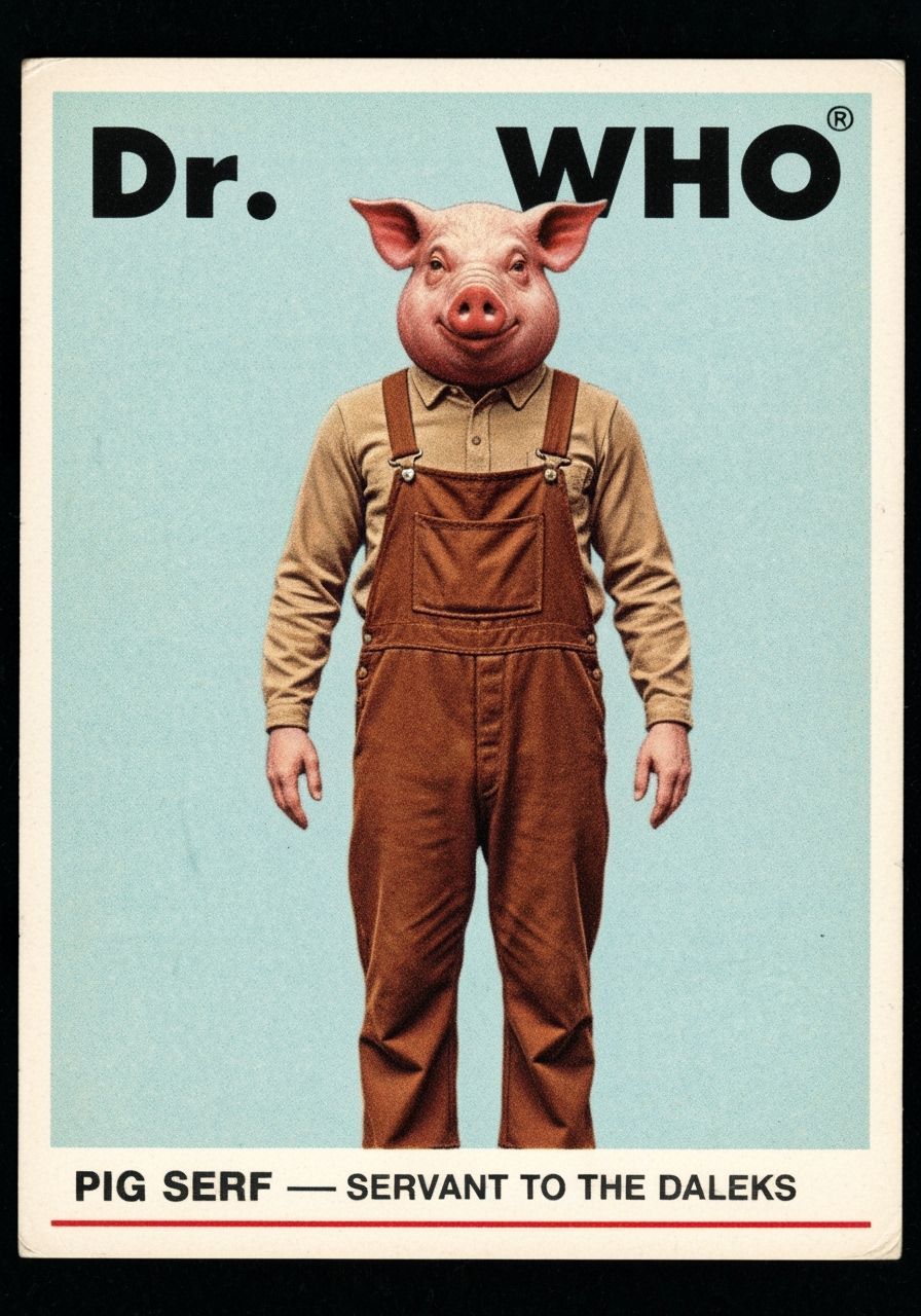 This vintage Dr. Who trading card features a Pig Serf, a genetically modified human with a pig's head, serving the Daleks. It captures a unique sci-fi character.