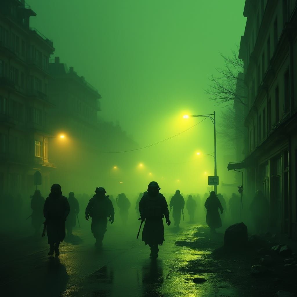 This image depicts a desolate, nightmarish cityscape under siege, shrouded in a toxic gas haze, with civilians fleeing in panic and soldiers struggling to restore order.