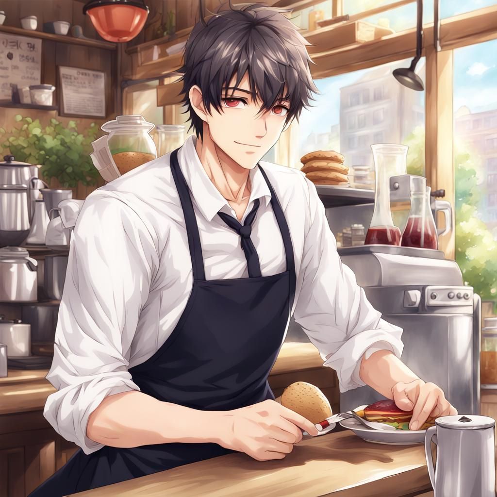 This image shows a handsome man wearing an apron while working at a cafe. The image is in the style of anime key visual art, reminiscent of Japanese manga and pixiv styles.