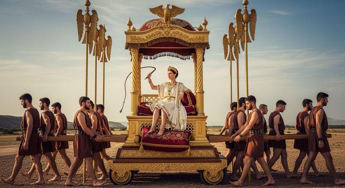This image depicts a Roman Empress on a gold throne litter, attended by bearers. Shot with professional photography techniques, it features natural lighting, a bokeh effect, and vibrant, high-contrast colors.