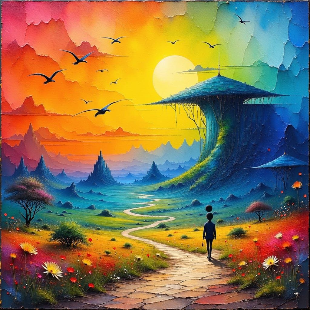 A surreal landscape featuring dreamlike scenery. The image is rendered in a vibrant gouache style, with impasto brushstrokes and textured watercolor layers, blending impressionist and maximalist elements to create a striking visual.