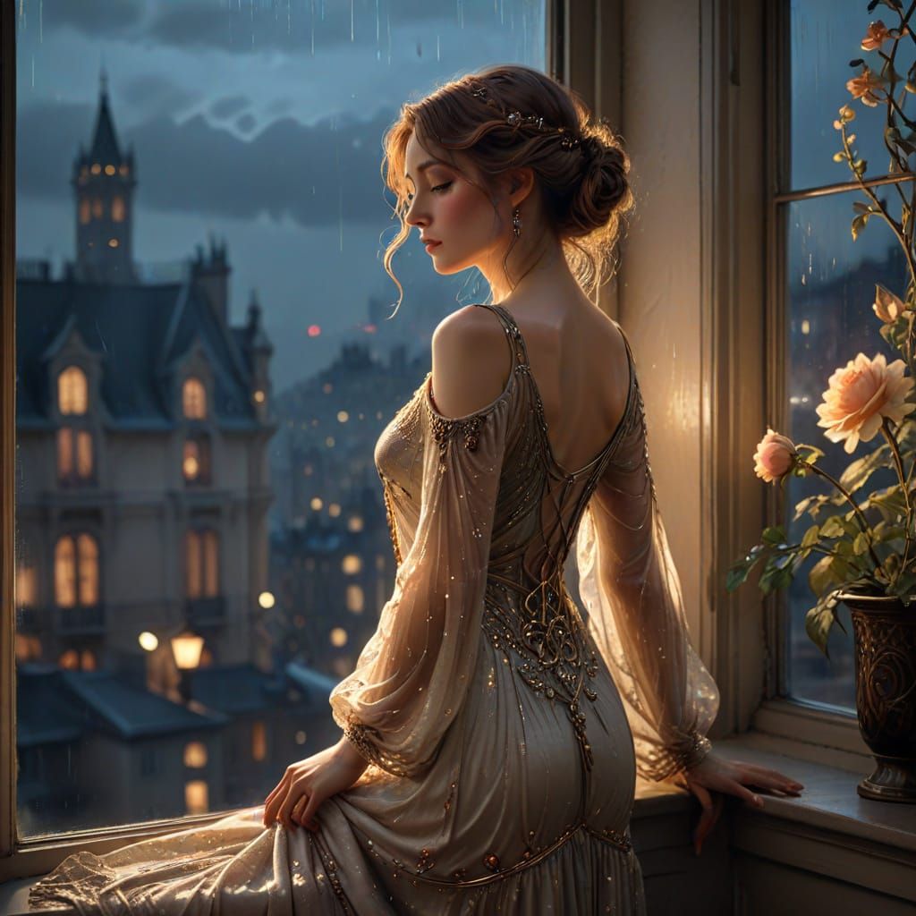 A solitary woman in a vintage dress looks out at a rain-streaked city. This painterly photo captures her silhouette by the window with subtle backlighting, evoking a melancholic atmosphere.