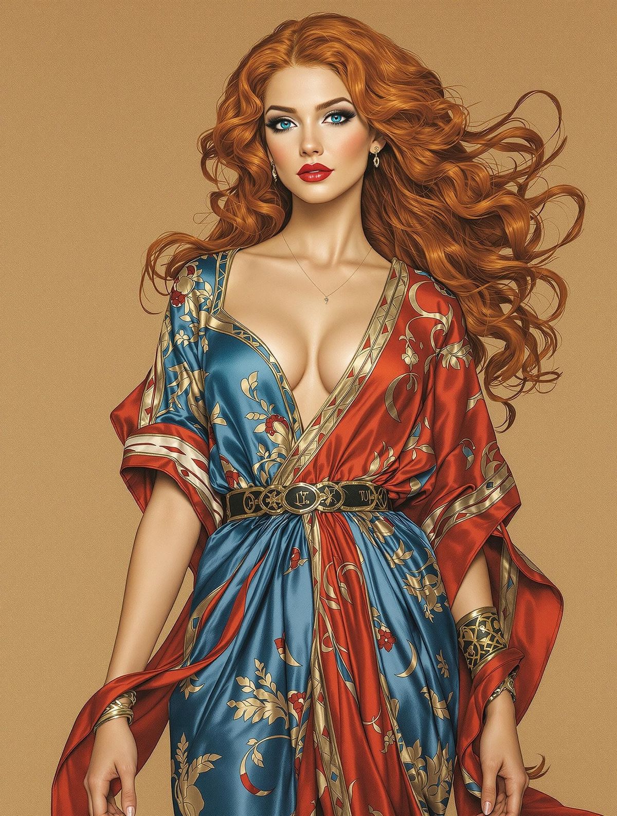 This image shows a slender, auburn-haired woman with blue eyes in a flowing silk tunic. The artwork features elegant lines and vibrant colors in an art nouveau style.