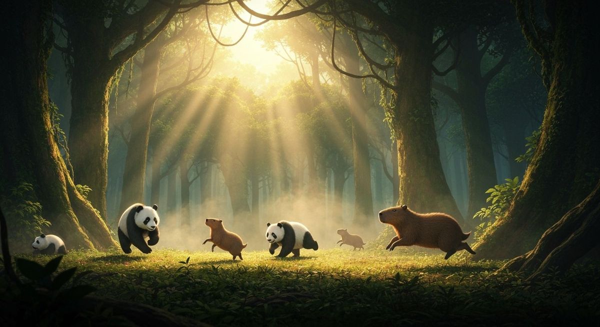 This image showcases pandas and capybaras joyfully playing tag in a dense forest. Sunlight streams through the trees, creating dramatic godrays and a warm, golden-hour atmosphere with vibrant colors and HDR lighting.