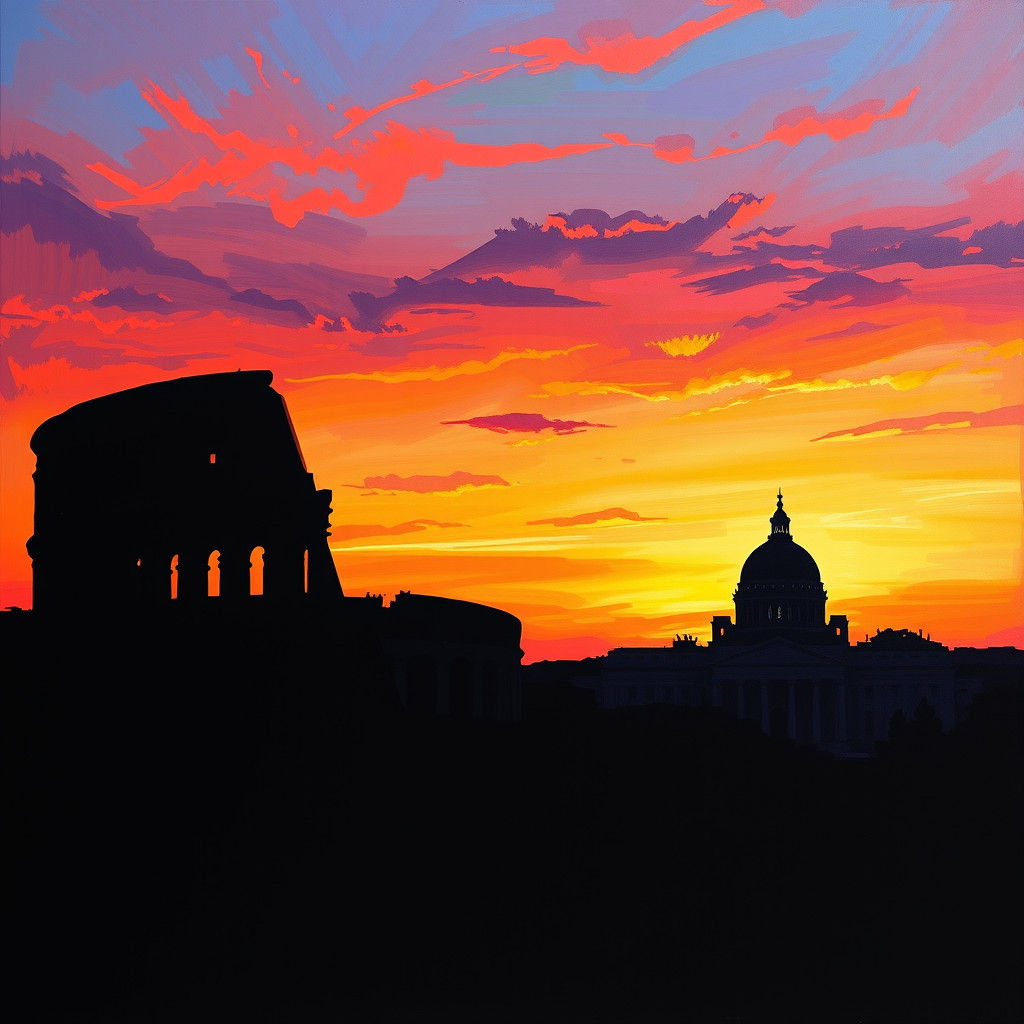 A striking picture of Rome's skyline silhouetted against a colorful sky. The image evokes Romantic landscape paintings with expressive brushstrokes and rich, deep colors.