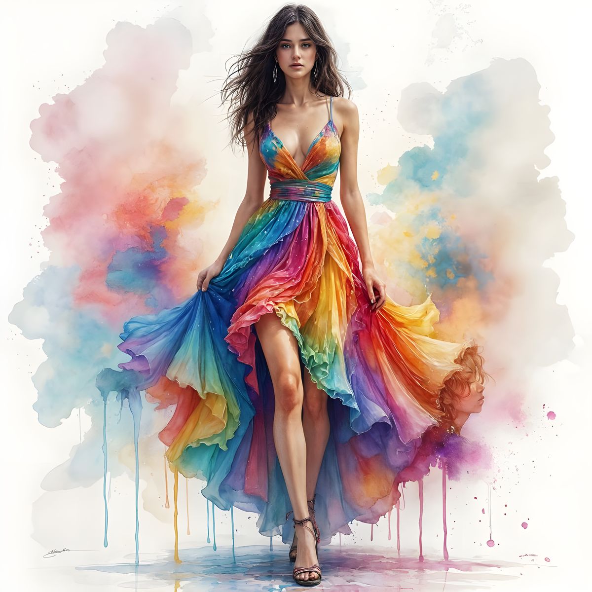 A vibrant image of a woman in a colorful dress, rendered in alcohol inks. The artwork evokes watercolor techniques and cinematic stylization, with expressive linework and splashy white space.
