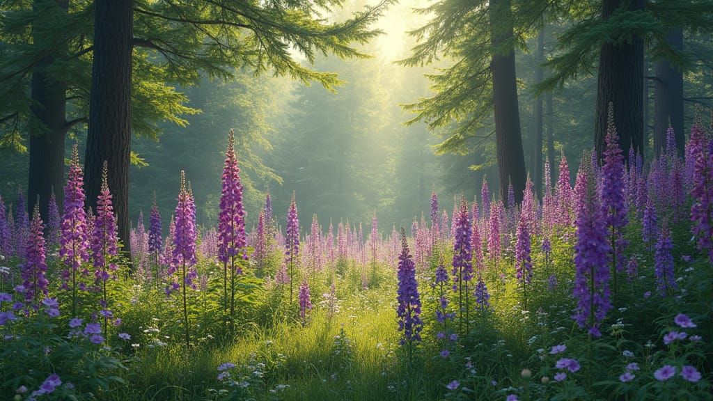This image depicts a lush forest meadow featuring a vibrant purple Foxglove and Lupin, set amidst a dappled sunlight environment reminiscent of classic botanical illustrations and Old Masters' work, with intricate textures and high-contrast colors.