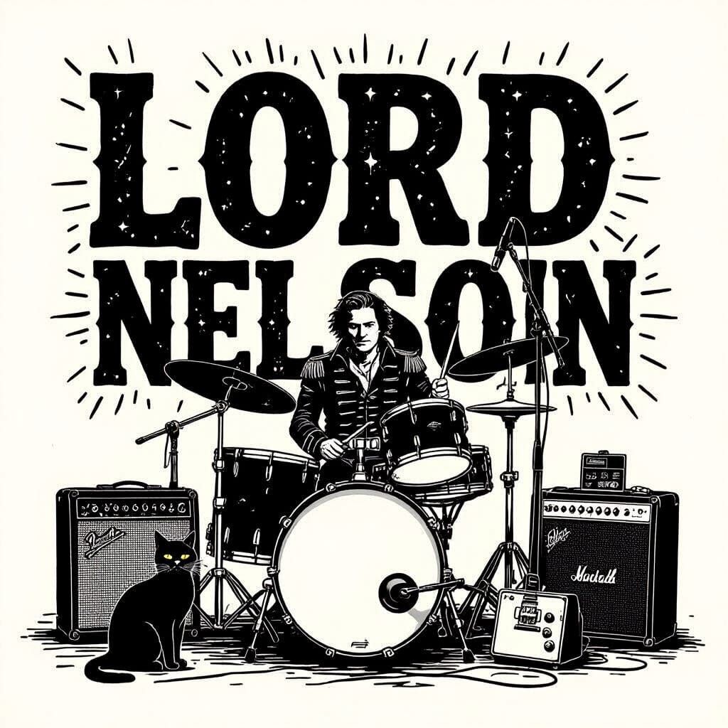 This image shows a band merchandise design in high-contrast black and white. The design features the band name "Lord Nelson" with detailed line art of musical equipment and a small black cat.