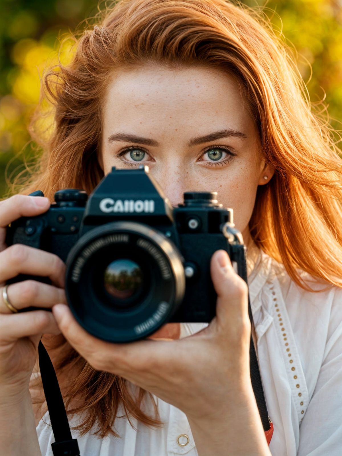 This image showcases a young woman lost in thought behind a vintage camera, surrounded by a serene and artistic atmosphere, with warm sunlight highlighting her features.