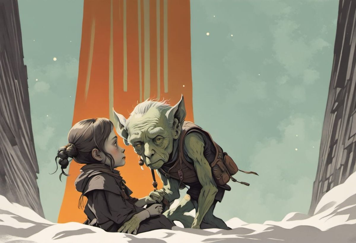 This image shows a mother holding her husband in a tender yet intense moment, set against a backdrop of a poorly drawn mossy giant, in a style reminiscent of modern European ink painting with vibrant, saturated colors and high contrast.