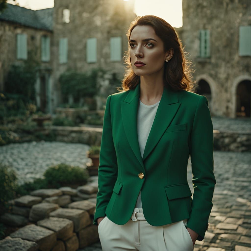 This image shows a woman in a green blazer in a sunlit courtyard. The cinematic portrait features soft focus and a film noir aesthetic, reminiscent of classic 35mm film.