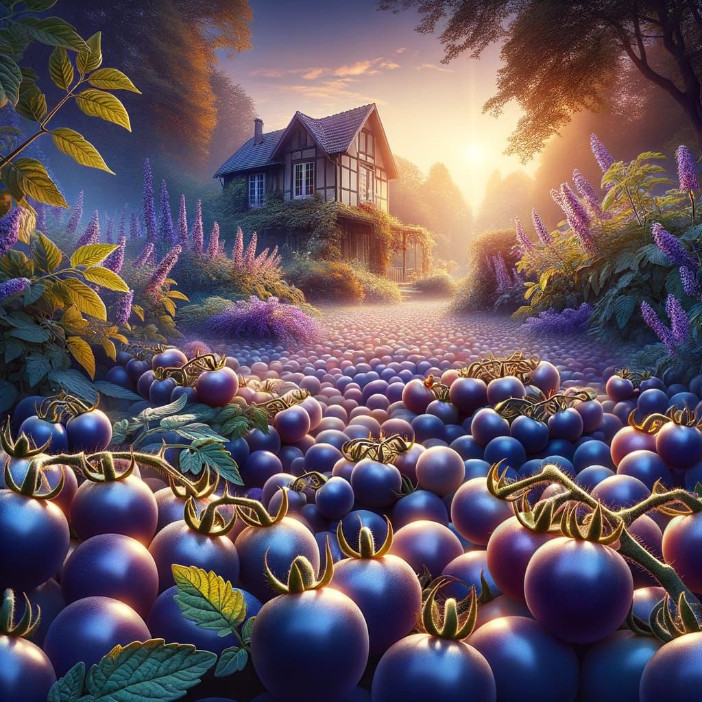 This serene garden scene showcases a lush abundance of ripe indigo rose cherry tomatoes, surrounded by the warm glow of sunlight and the comforting presence of a charming home in the distance.