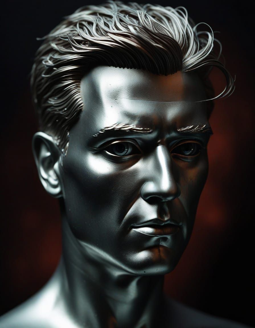This image shows an eerie figure in a surreal close-up, reminiscent of mixed media art. The stroboscopic lighting, metallic reflections, and earthy tones create a high-contrast, detailed composition.