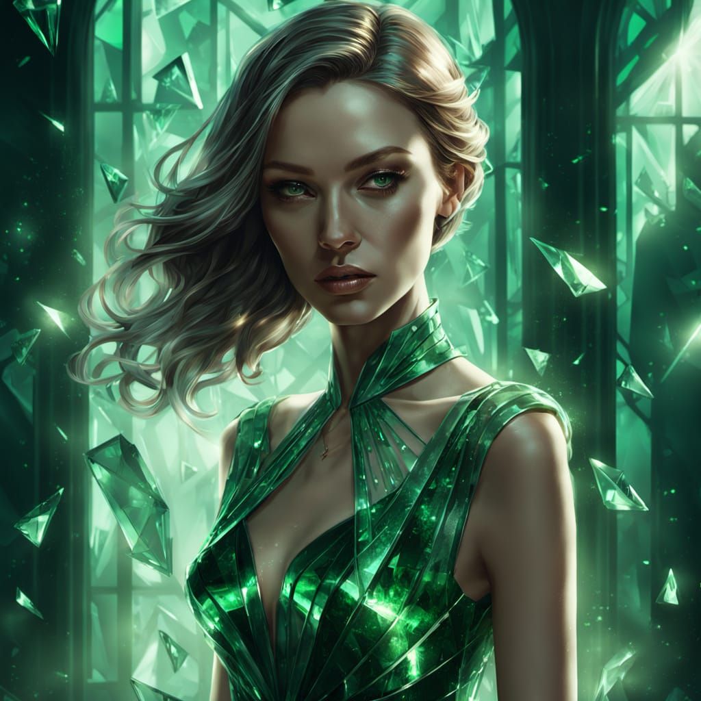 This realistic digital painting showcases a beautiful woman in an elegant green glass dress made of emerald shards. Features reflective surfaces, moody lighting, and intricate details.