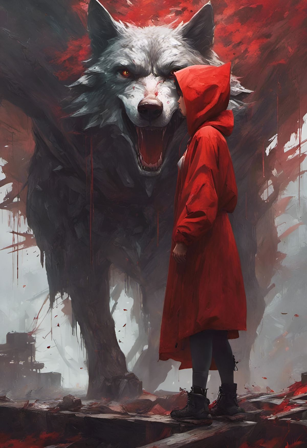 A hyperdetailed portrait of Red Riding Hood and the Big Bad Wolf. This image showcases a cyberpunk aesthetic with maximalist elements, rendered in 8K resolution.