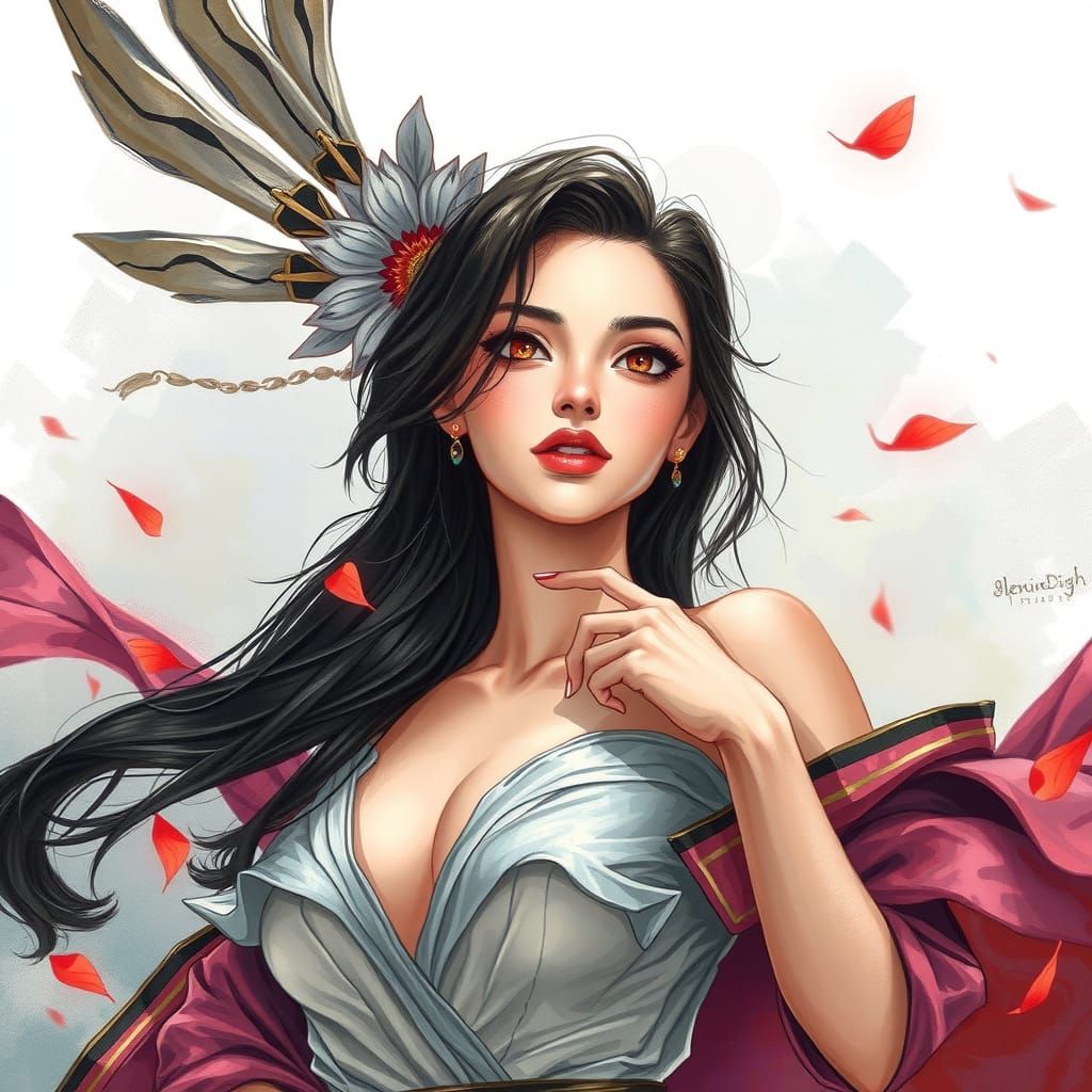 A vibrant digital illustration of a woman posing with an elegant outfit. The artwork blends watercolor and pencil sketch styles, featuring intricate details, smooth focus, and deep colors in a fantasy art style.