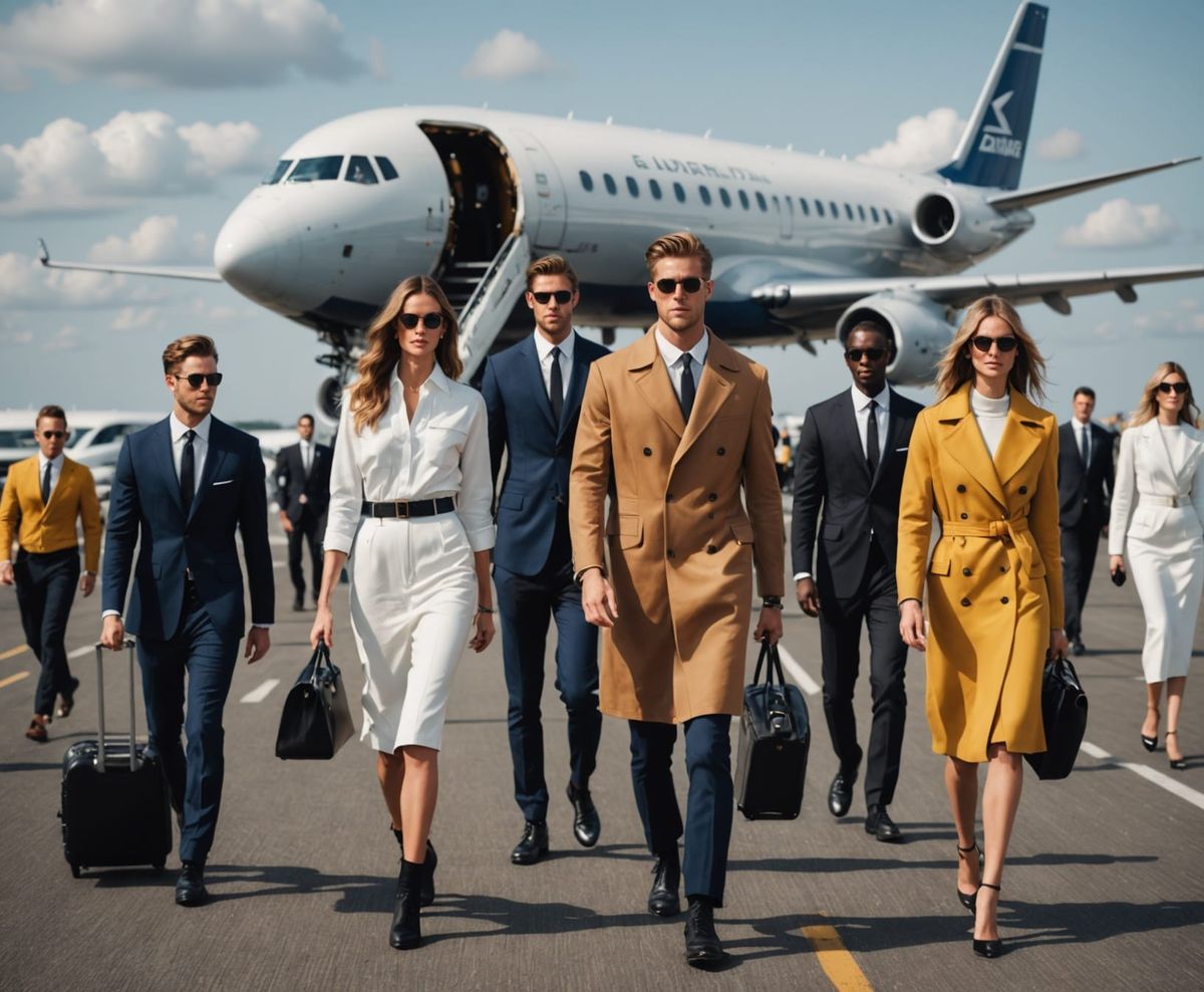 This image captures the intersection of high fashion and air travel, featuring models showcasing a designer clothing line on an airport runway amidst the hustle and bustle of air traffic.