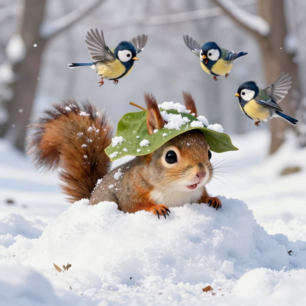 Cartoon illustration of a pile of snow with a squirrel's head suddenly emerging, wearing a folded leaf hat and covered with bits of white snow on his fur. Chirping birds fly away with surprised expressions. Winter park scene. Detailed, whimsical and painterly