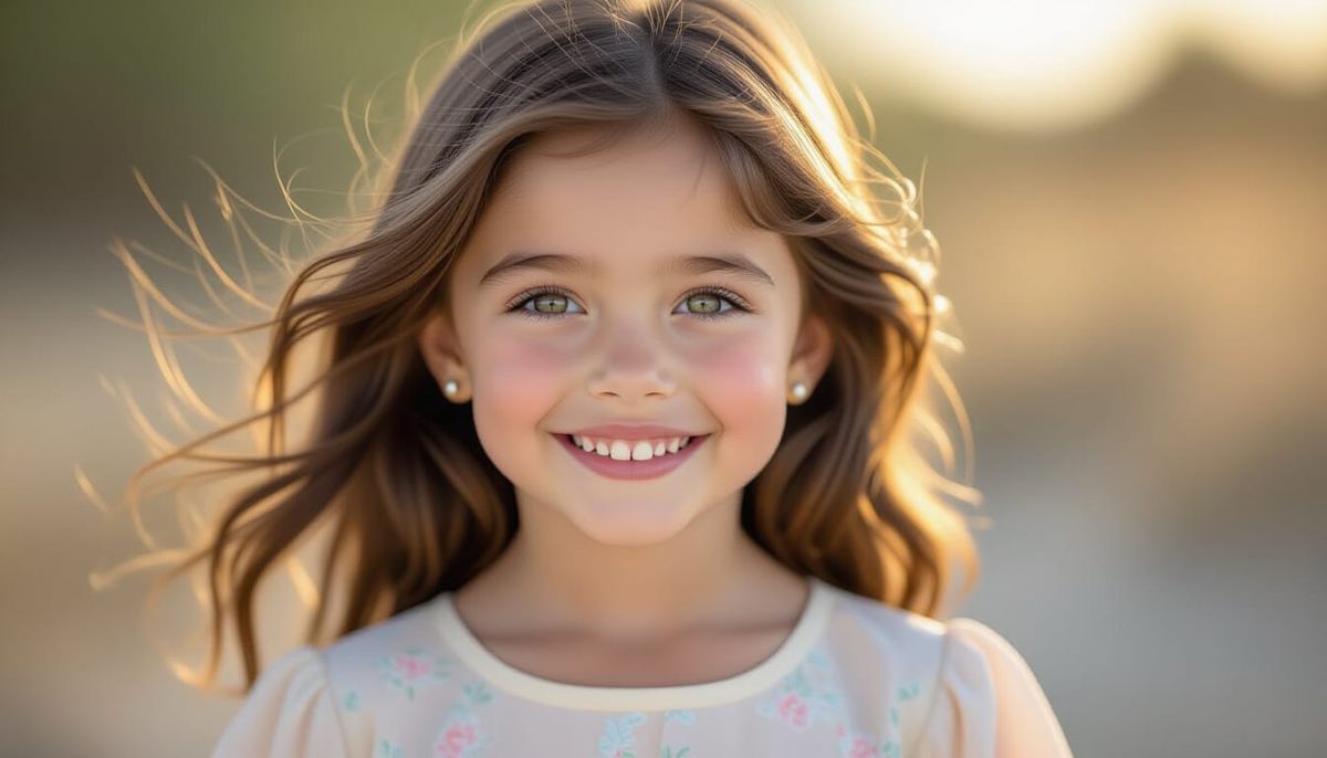 A radiant 7-year-old girl with sparkling eyes and flowing brown hair smiles joyfully in this portrait. Captured during golden hour, the image showcases ultra-realistic detail and cinematic depth of field.