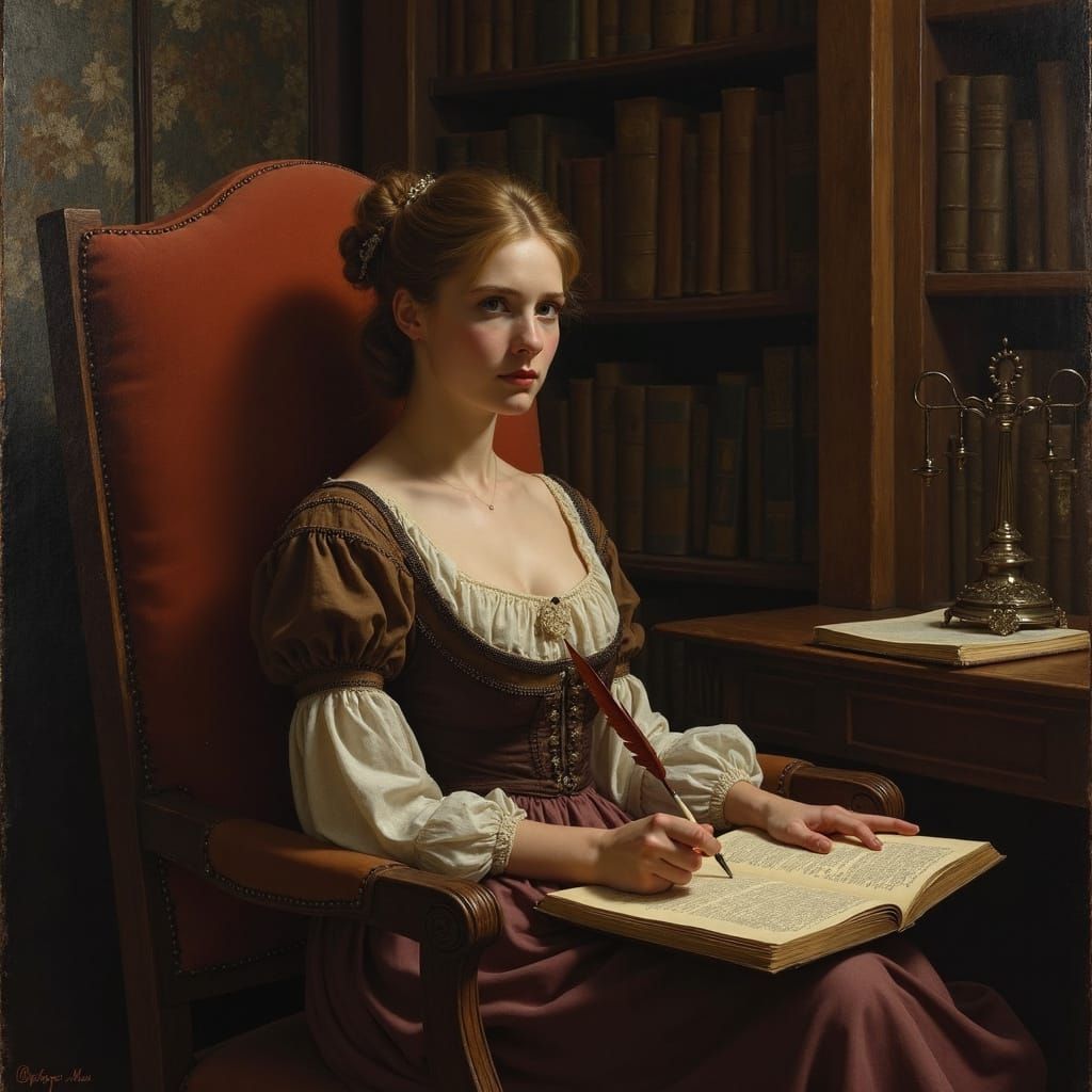 This image shows a woman with a quill in a dimly lit library. The vintage oil painting style features chiaroscuro lighting, warm tones, deep shadows, and detailed realism.