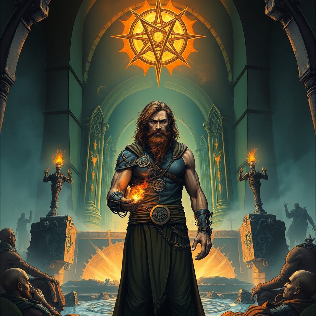 This image shows a male psion with brown hair and beard standing before an unholy altar adorned with mystic symbols. The artwork evokes a dark fantasy aesthetic.