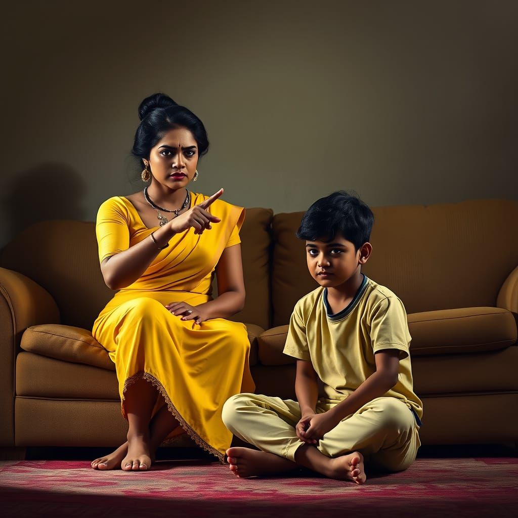 A realistic, cinematic image depicting an Indian woman in a yellow outfit seriously admonishing a young man. Dramatic lighting enhances the intense, emotional scene.