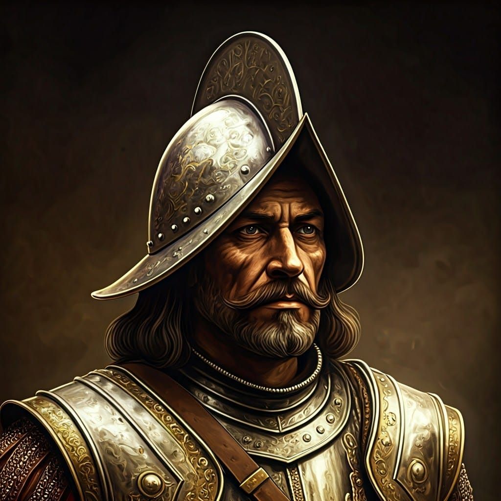 This image is a highly detailed digital painting of a conquistador soldier, showcasing intricate historical details and a rich, atmospheric color palette.